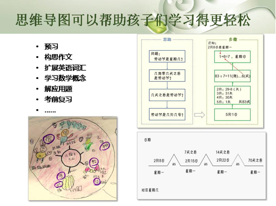 思维导图是一种基于大脑自然的思维方式。从一个中心点开始向四周发散,这种独特的发散性结构,培养孩子的放射性思维,激发孩子丰富的联想力和创造力。思维导图增强孩子思维的条理性。孩子在绘制思维导图时,必须将脑中产生的各种想法按照一定顺序排列或按照属性予以分类,绘制成思维导图,让孩子的思维变得更有组织、更清晰,更有条理。思维导图帮助孩子把注意力专注在一个主题上,围绕主题思考与它相关的所有因素,对所研究的问题进行全面系统的思考,不断提升孩子解决问题的能力。思维导图能够充分体现孩子的思维特点,具有非常强的个性化特征。有利于孩子个性的张扬,充分体现个体思维的多样性。