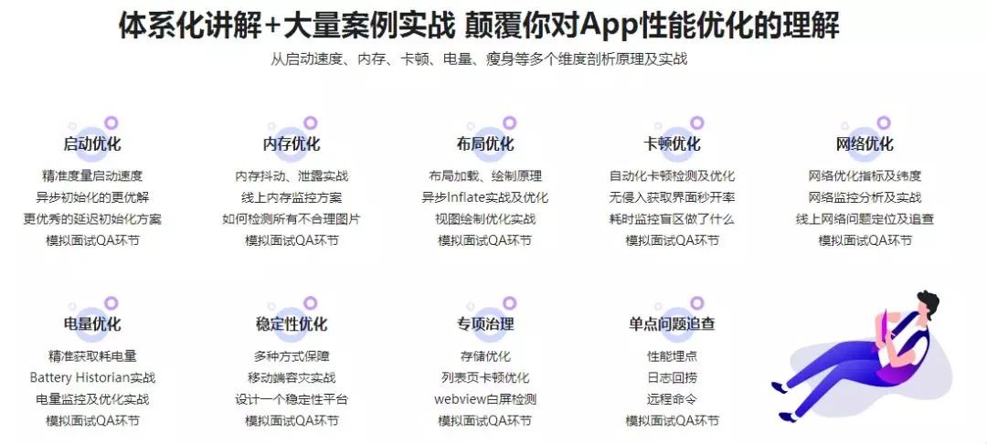 针对性方案:以APP优化为核心,八大方案,多角度、多方向,多思路,带你系统掌握Android性能优化的难点及处理技巧,让你不再“抓瞎”。