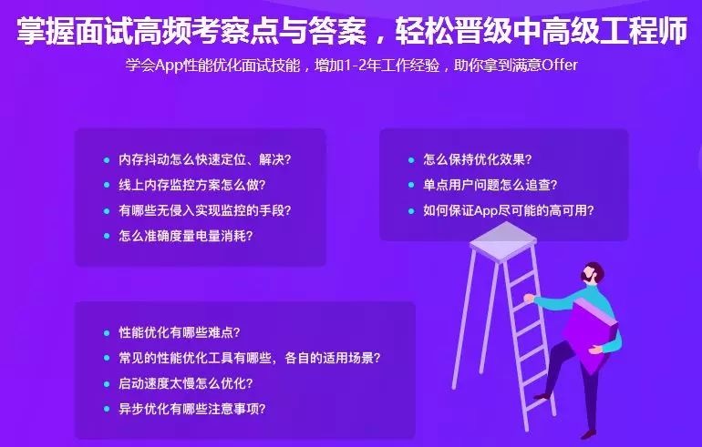 该课程除了解决你当下的困惑,也为你未来的发展做好了准备。课程中将探讨APP性能优化面试的高频考点,为你更全面的揭秘答案与原理,助你在面试中轻松拿到心仪offer。