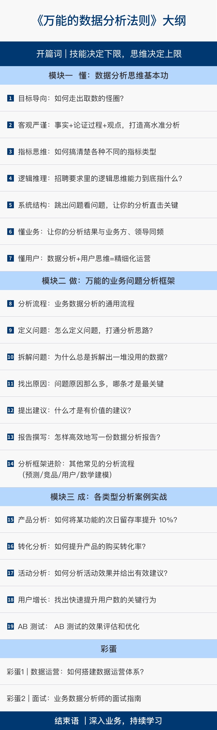 这个专栏的学习,没有任何专业或工具门槛,为了让你更好地具备数据分析思维,会从以下三大模块为你讲解: